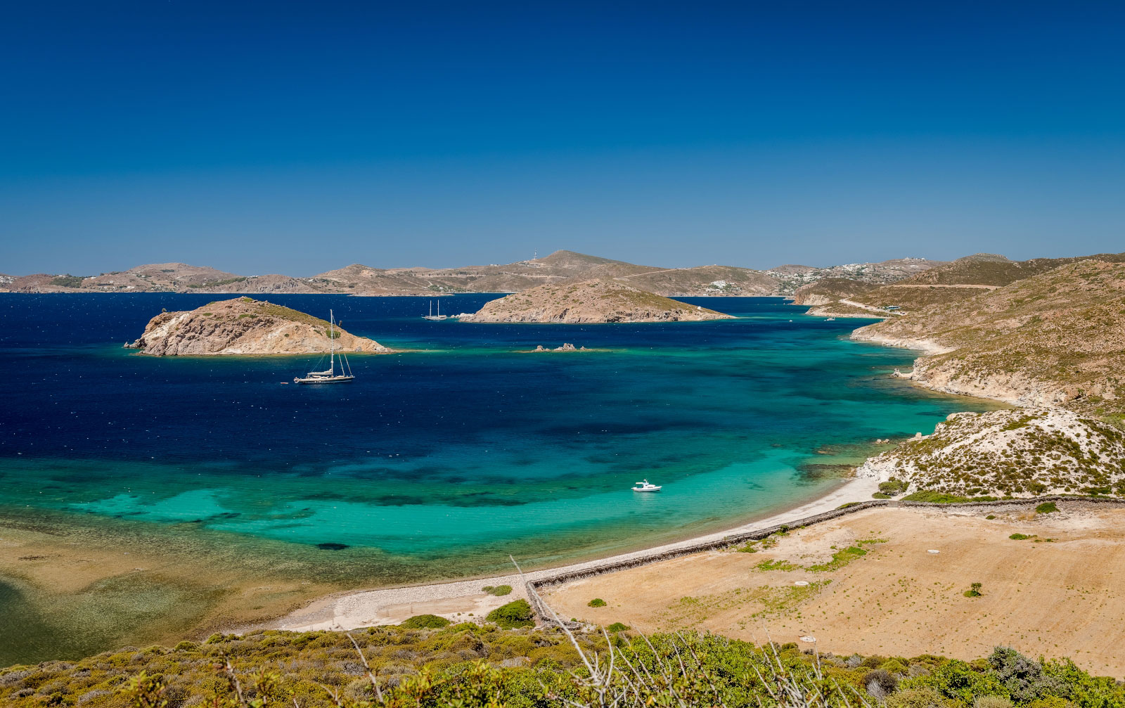 Agrio Livadi beach is on the way to Kampos, 3.5 km from the port, opposite to Agia Thekla islet. Agrio Livadi is a beach with sand and pebbles, organized with sunbeds, watersports etc.